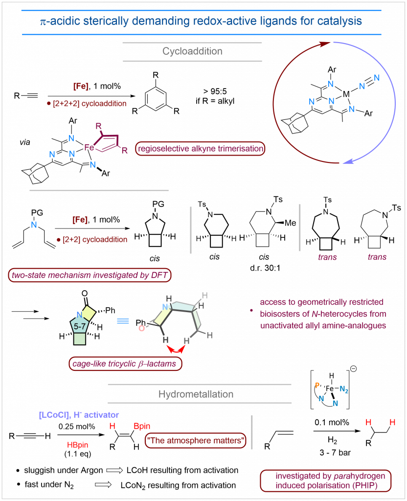 Alkyne trimerization and [2+2]-cycloaddition. Pyrimidinediimine scaffolds are π-acidic analogues of the well-established pyridine-based analogues but with increase robustness under reductive catalytic conditions. The reduced propensity towards deactivation has enabled the development of examples of the most active cycloaddition catalysts based on iron. A first general 1,3,5-selective alkyne trimerization reaction proceeds via an iron 1,3-metallacycle intermediate which could be isolated and characterised. Pyrimidinediimine iron complexes also enabled the development of a highly efficient [2+2] cycloaddition of unactivated olefins to yield cyclobutene rings fused with N-heterocycles of pharmaceutical relevance (pyrrolidines, piperiazies and azepanes). Many of building-blocks resulting from this method cannot be obtained through alternative synthetic methods and have led to the development of unique molecular motifs (Figure 1C). The investigation of the catalytic active species through spectroscopic and computational methods have allowed a lowering of the catalyst loading down to 0.5 mol% in some cases. The resulting motifs are amenable towards downstream functionalisation to yield unique cage-like tricyclic β-lactams.