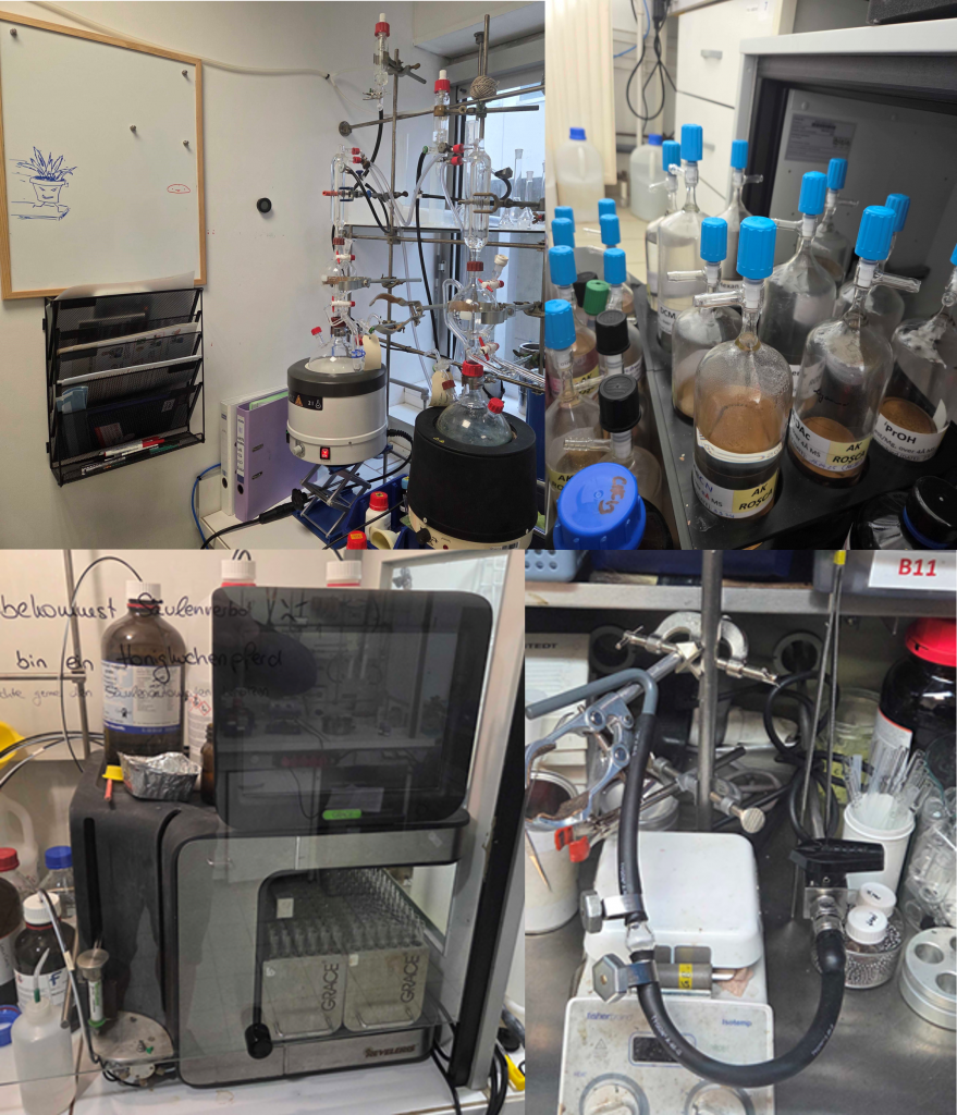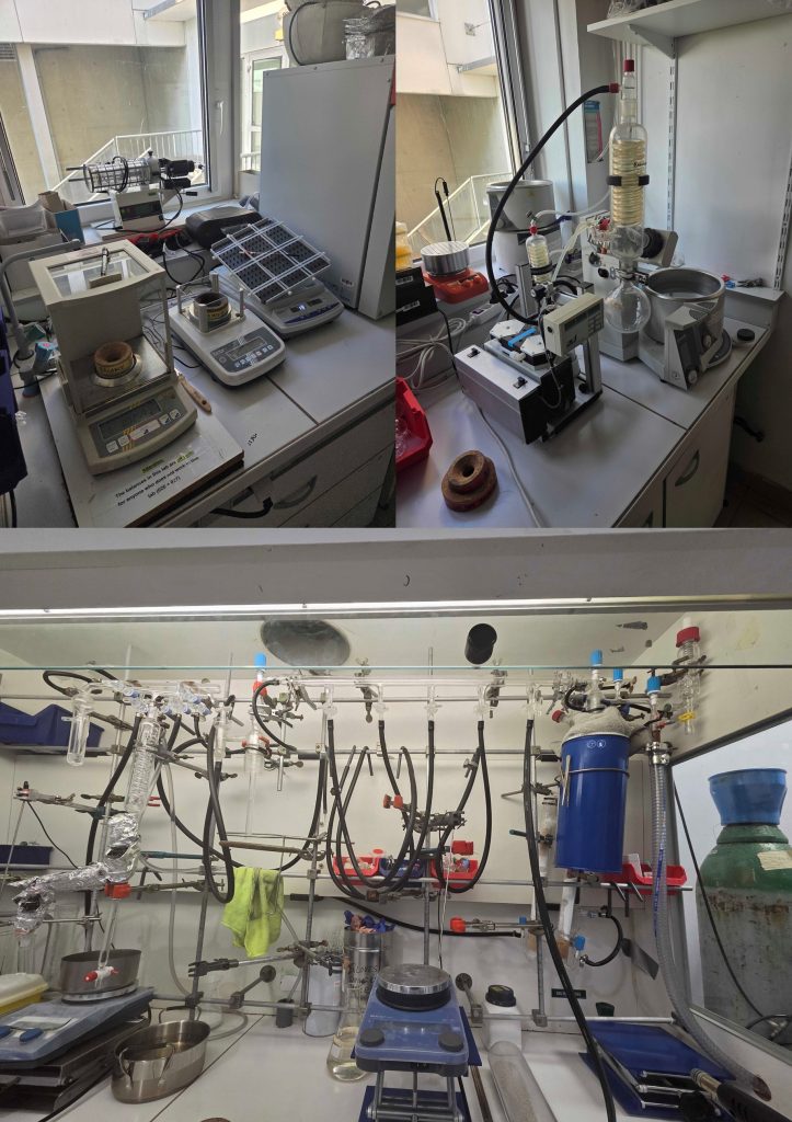 Both labs (in Rennes and in Heidelberg) are equipped with the standard infrastructure for conducting air sensitive chemistry. Each fumehood is equipped with a Schlenk line, operating under high vacuum which is ensured by periodically serviced vacuum pumps. Vacuum levels are monitored by manometers.