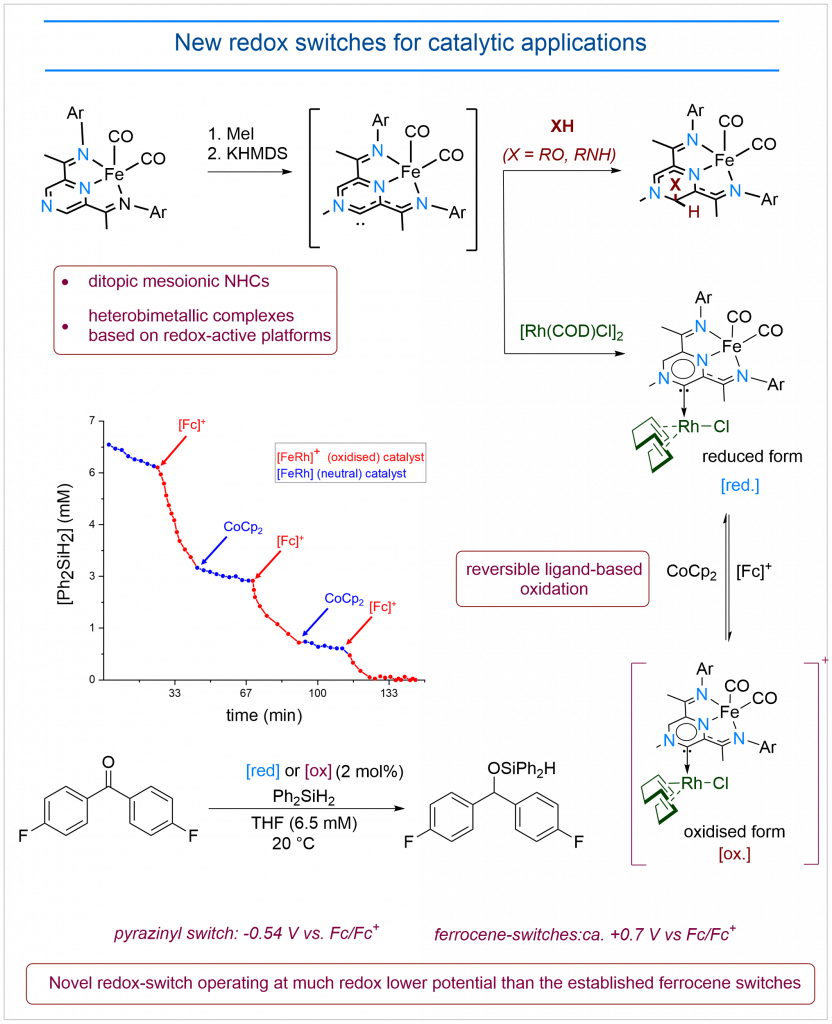 Complexes based on the redox-active pyrazinediimine ligands developed by our group can be functionalised at the distal pyrazine nitrogen atom, determining important changes in electronic structure. We have discovered that N-methylation of such systems followed by α-deprotonation, to give rise to a mesoionic NHC, where Fe is part of the ligand backbone. These NHCs are strong σ-donors and strong π-acceptors, and these properties can be further modulated by oxidation. The in-situ generated NHCs can add alcohols and amines (even sterically bulky amines such as HN(SiMe3)2) Complexation with noble metals (e.g. rhodium or iridium) gives rise to heterobimetallic complexes which are interesting and robust redox-switchable catalysts. This approach allowed us to obtain temporal control in catalysed hydrosilyation reactions. The new redox-switches differentiate considerably from the literature established ferrocene analogues, allowing the operation at significantly milder potentials. At the time of their publication, they were the only example of redox-switchable catalysts which utilise a metal-based redox-switch which is not based on metallocenes.